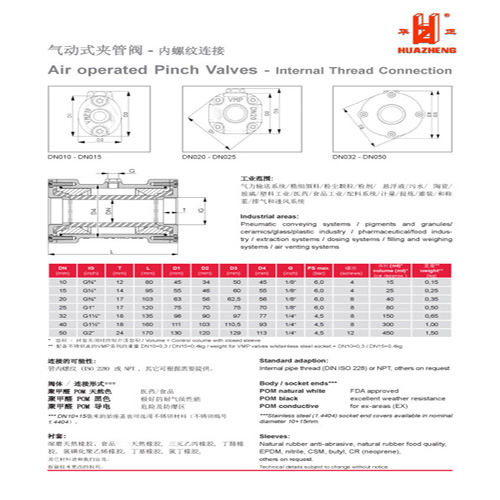 內襯套可采用12種不同彈性體材料:天然橡膠、食品天然橡膠、耐高溫天然橡膠、氯丁橡膠Neopren、三元乙丙EPDM、食品型三元乙丙EPDM、氟橡膠Viton、此外,KMC系列氣動夾管閥采用三種不同的閥體和套管蓋材料進一步擴大了KMC系列氣動夾管閥的應用領域。一般采用以下材料: